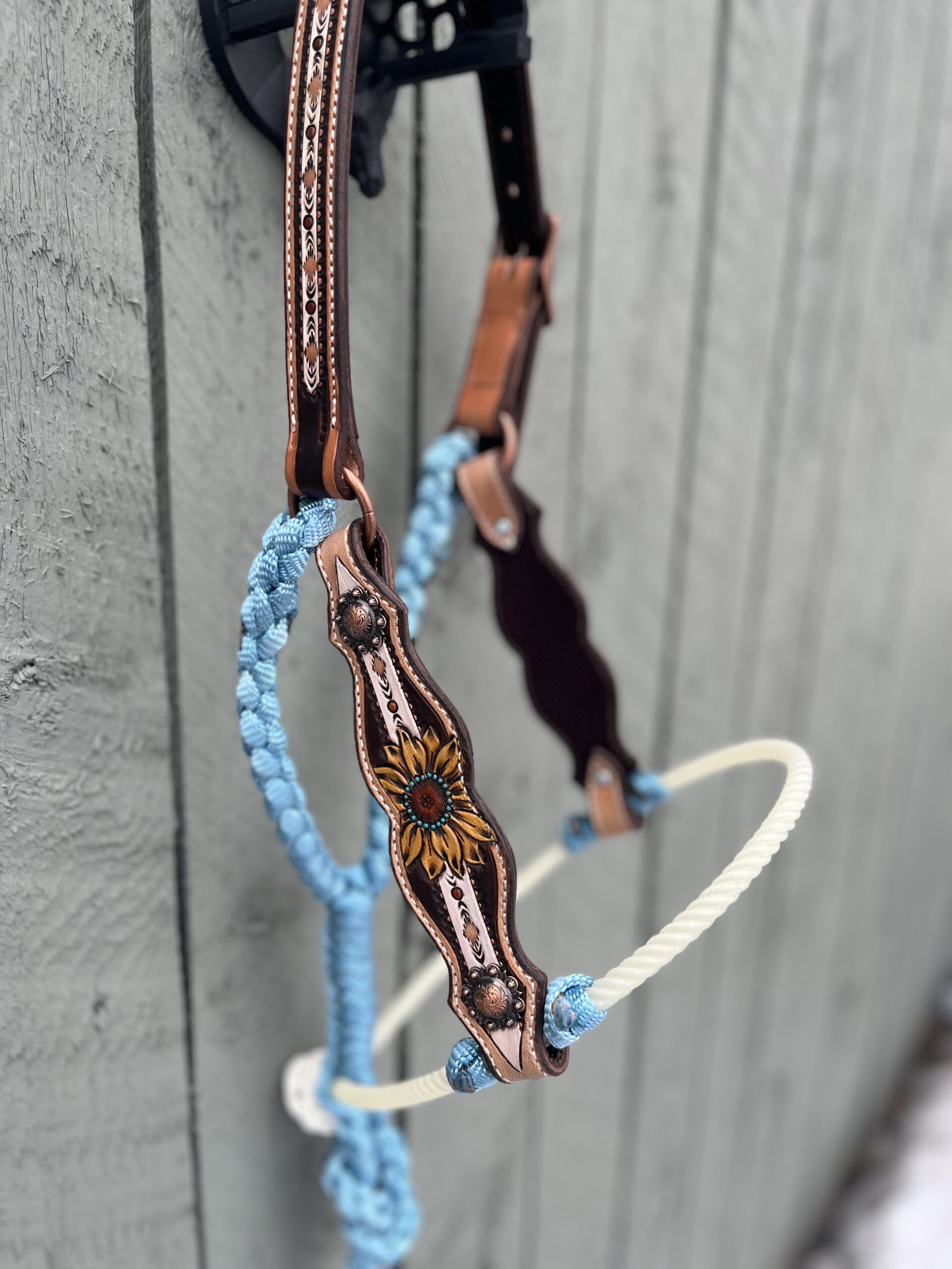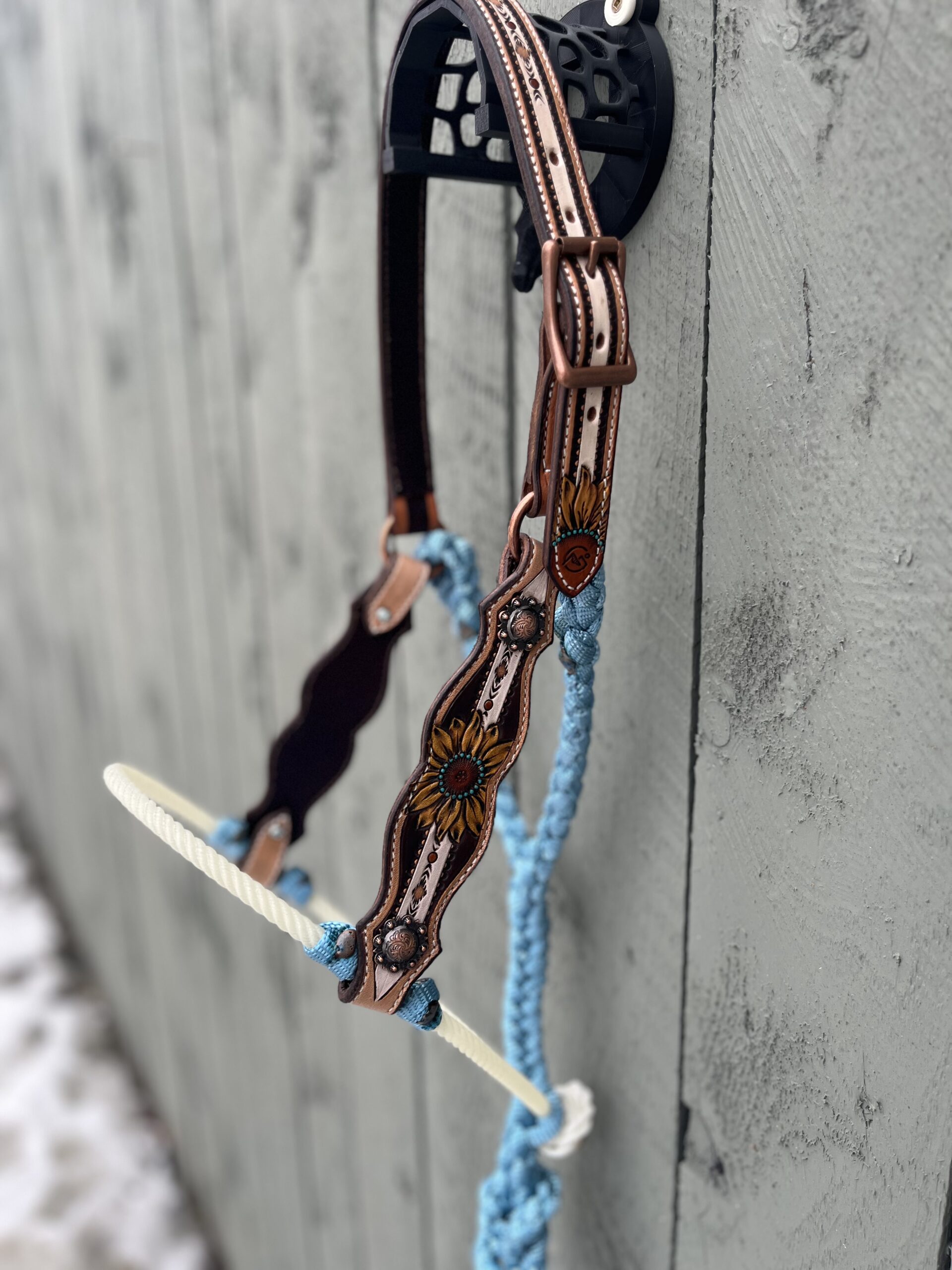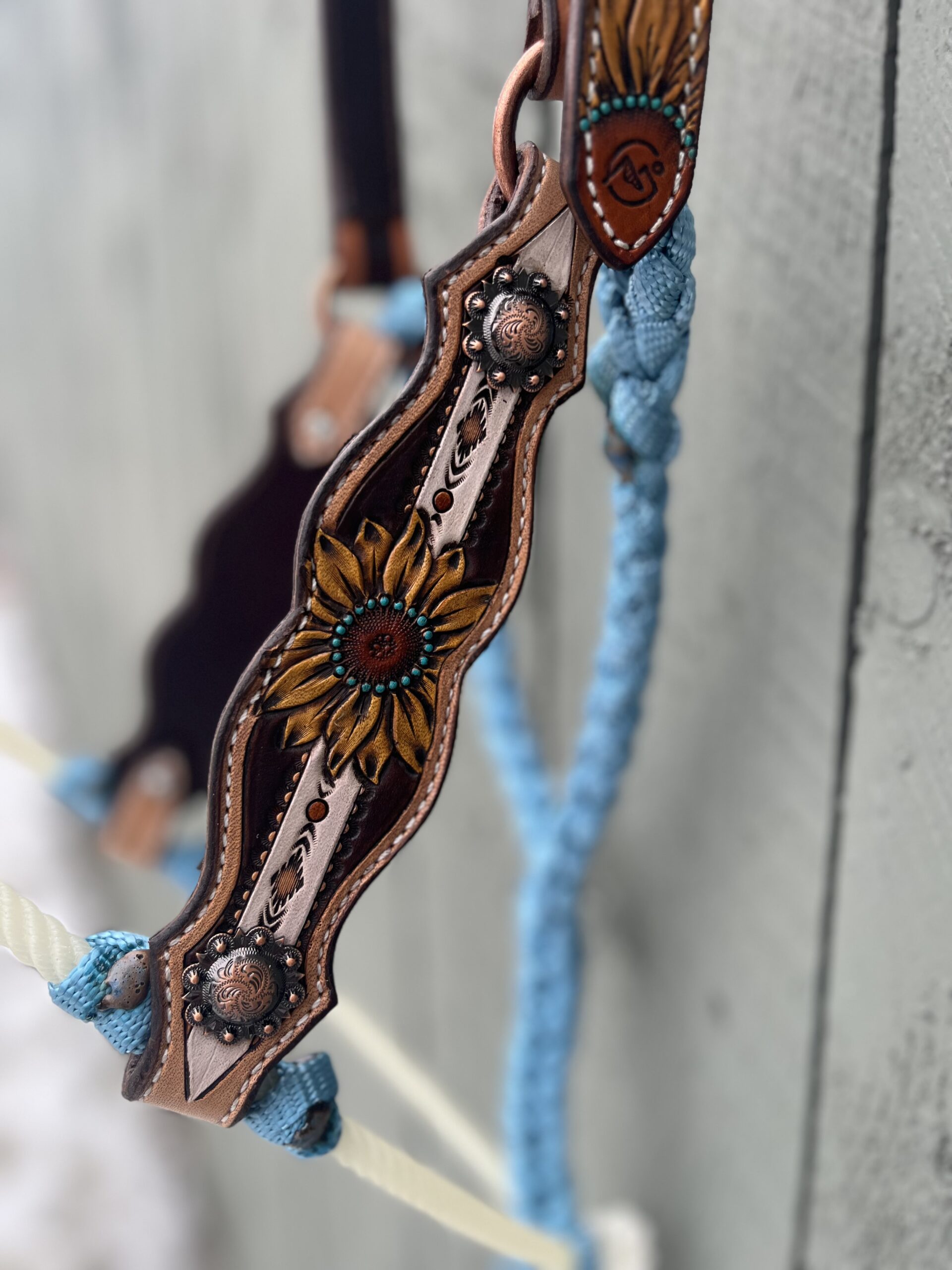 Hand tooled sunflowers on Hermann Oak leather. Lined with latigo. Average horse size. Removable lead rope.