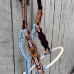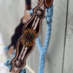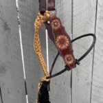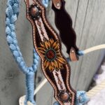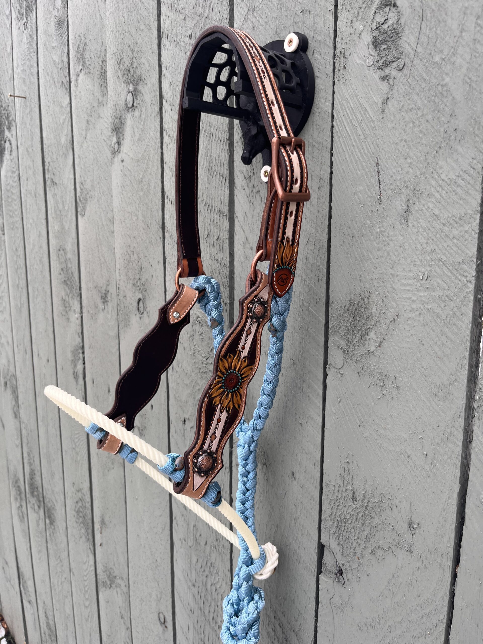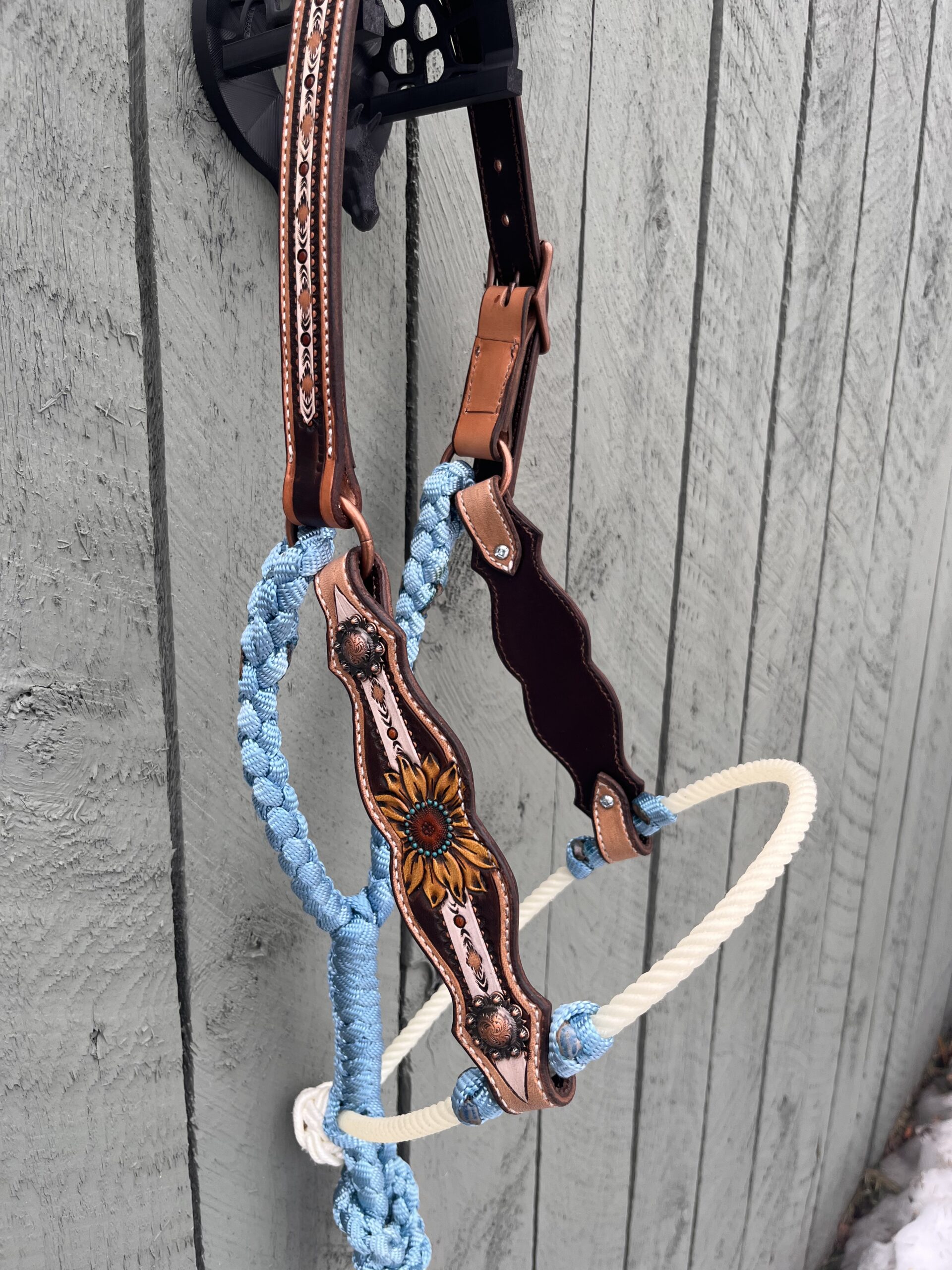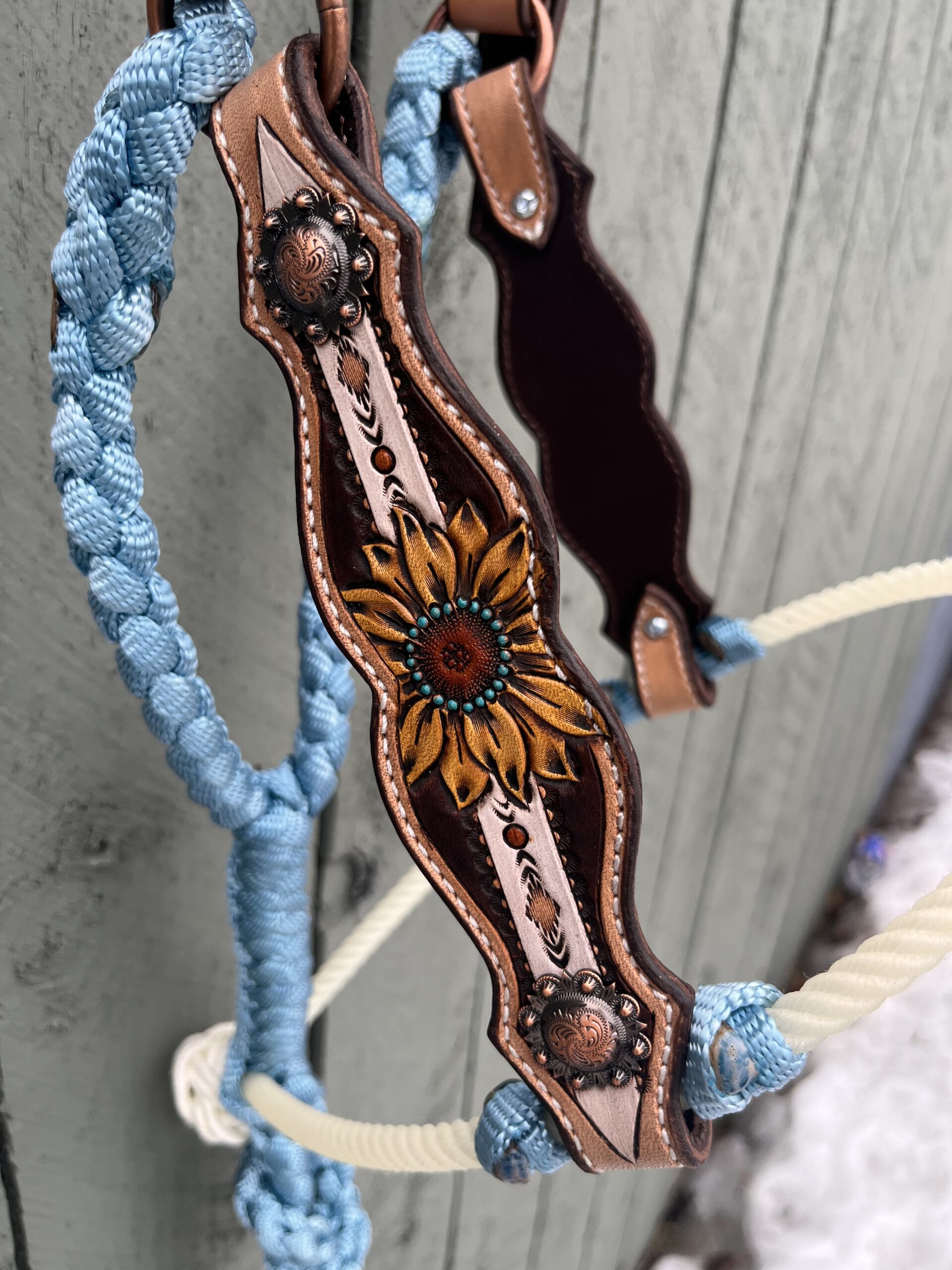 Hand tooled sunflowers on Hermann Oak leather. Lined with latigo. Average horse size. Removable lead rope.