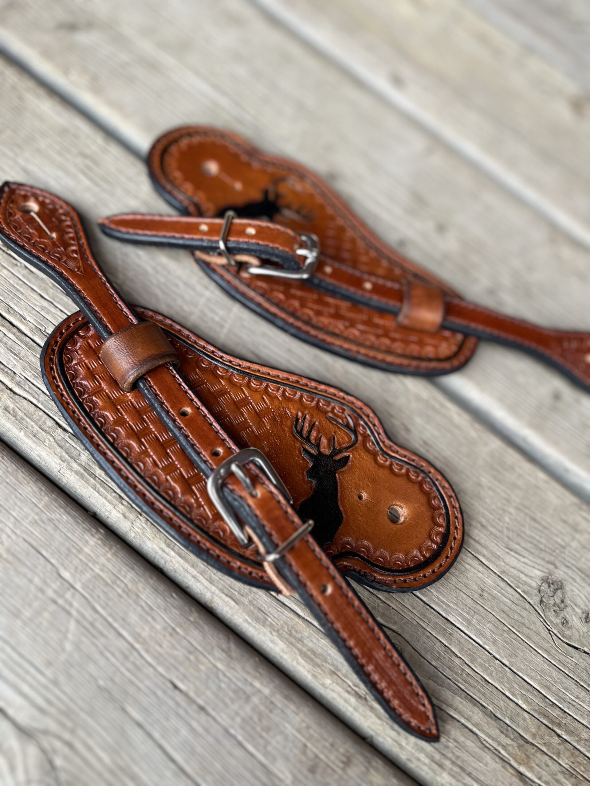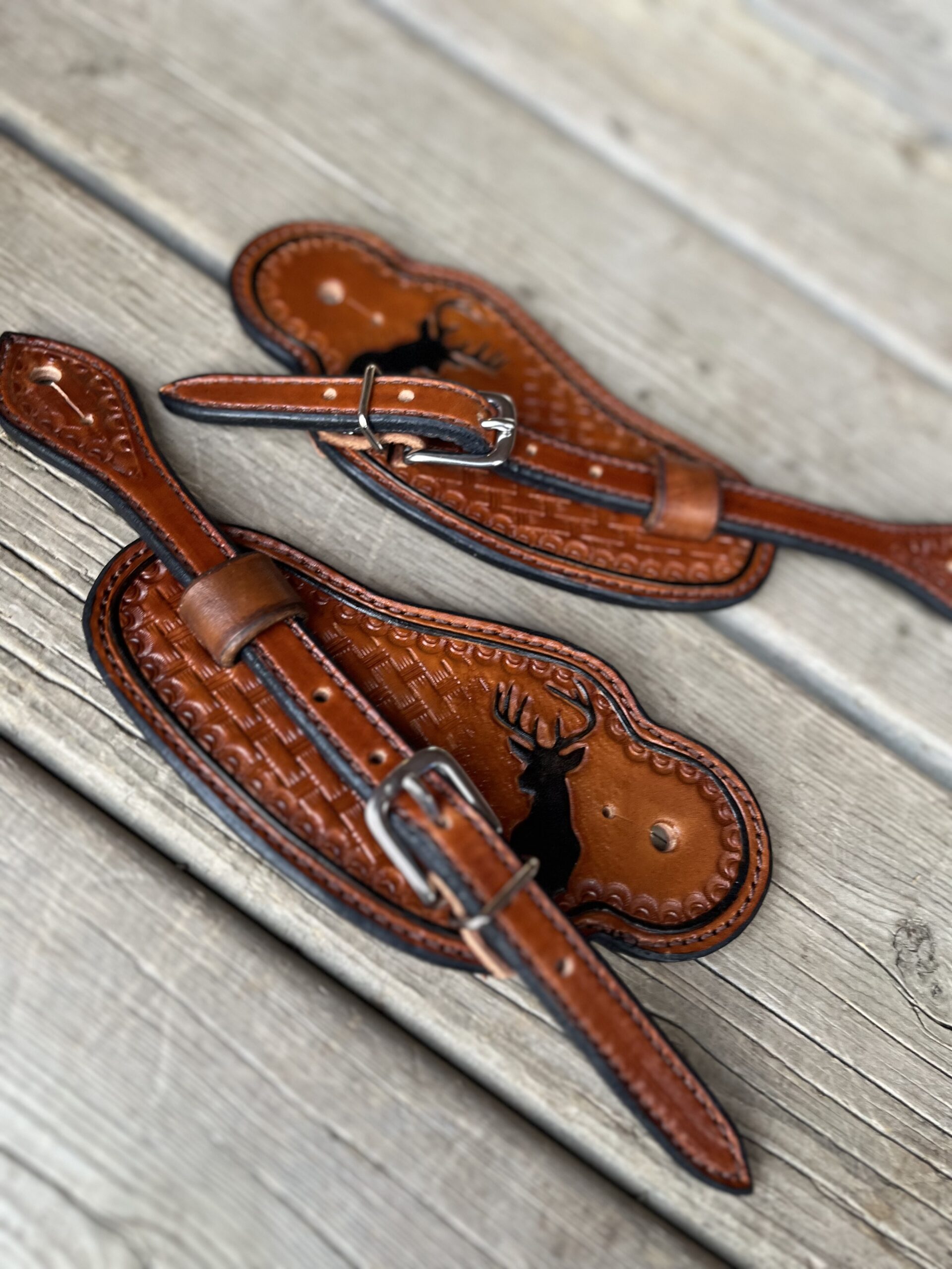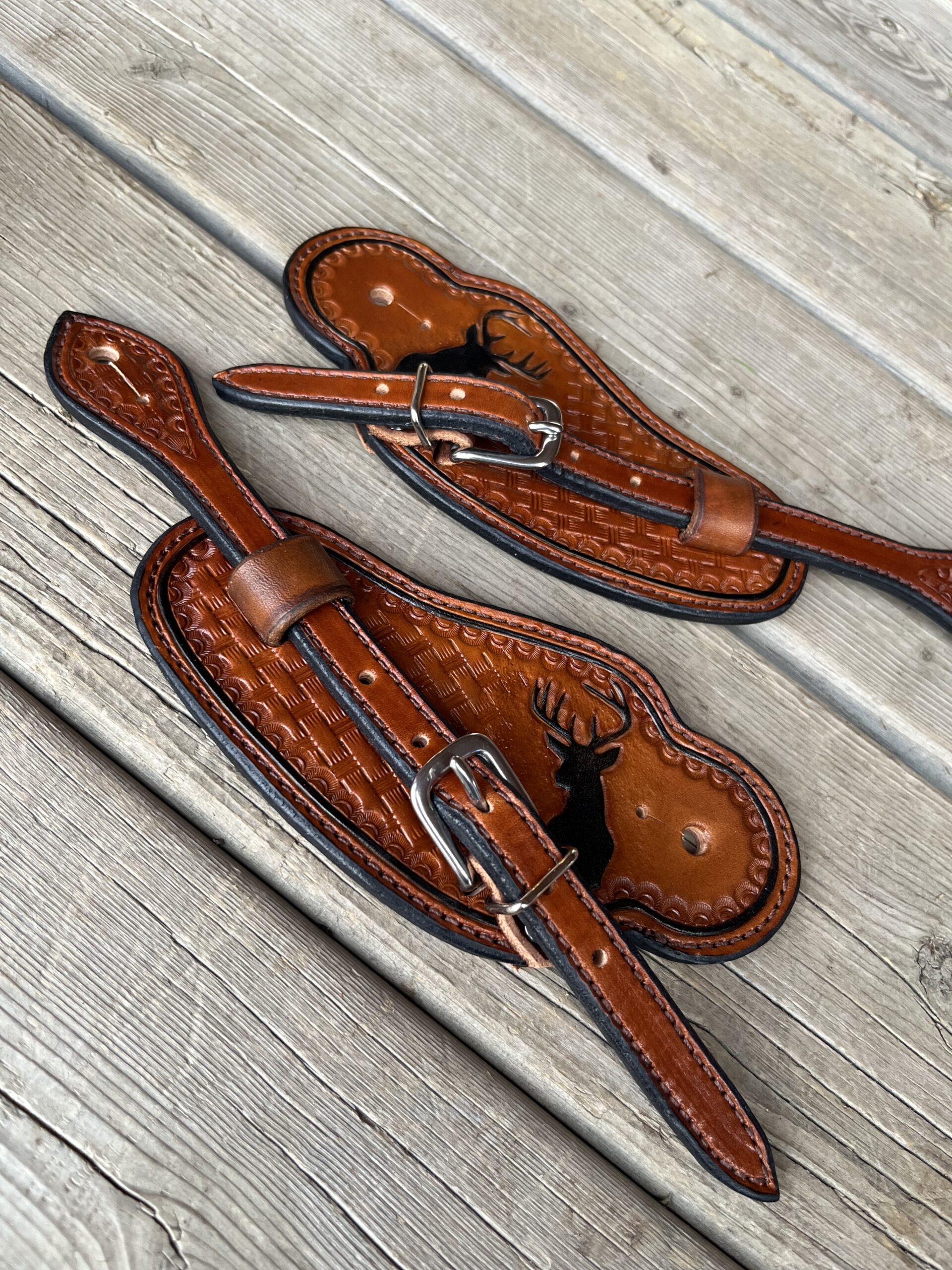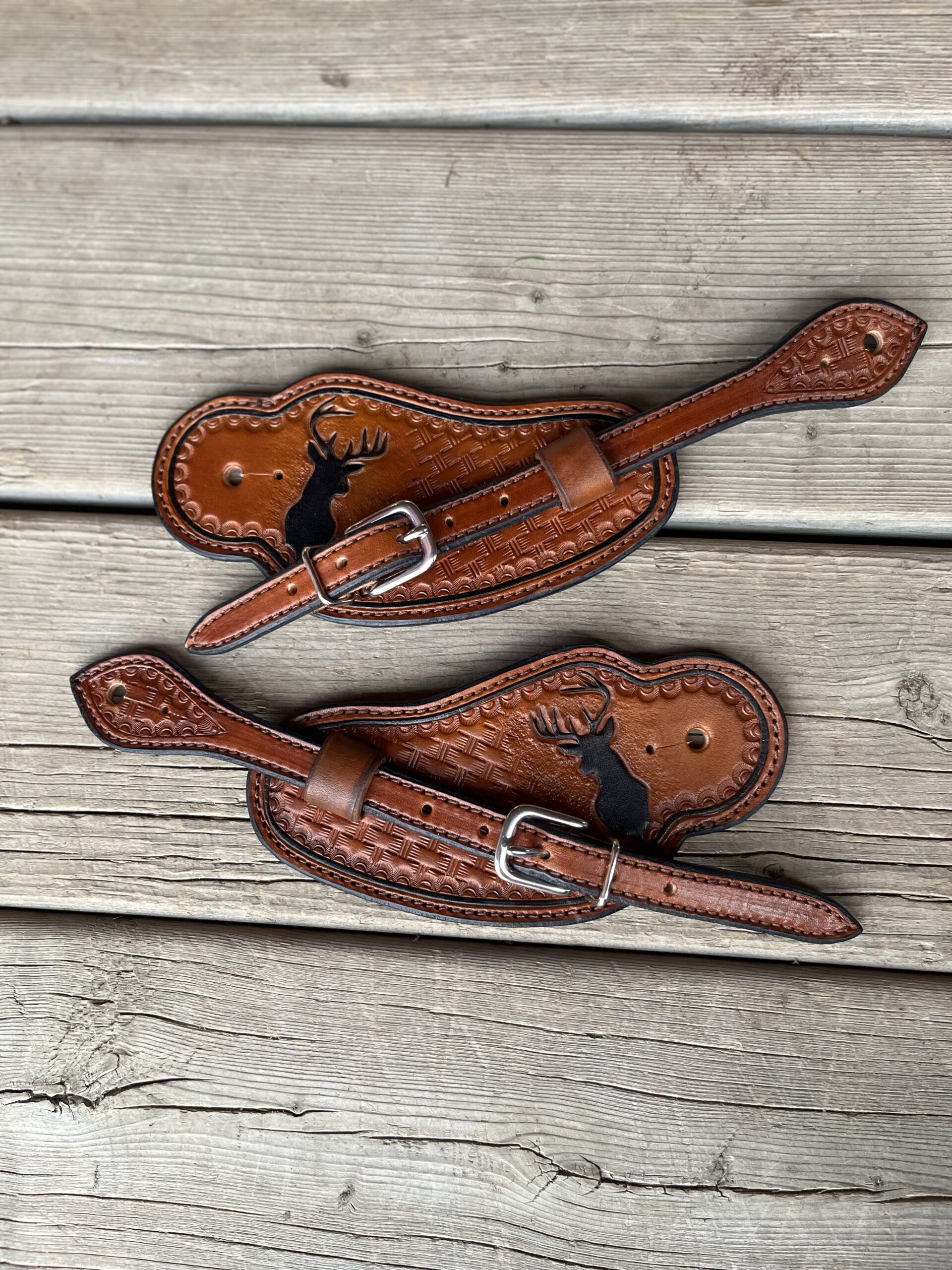 Basket weave stamp with buck silhouette and black border on medium oil leather.