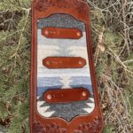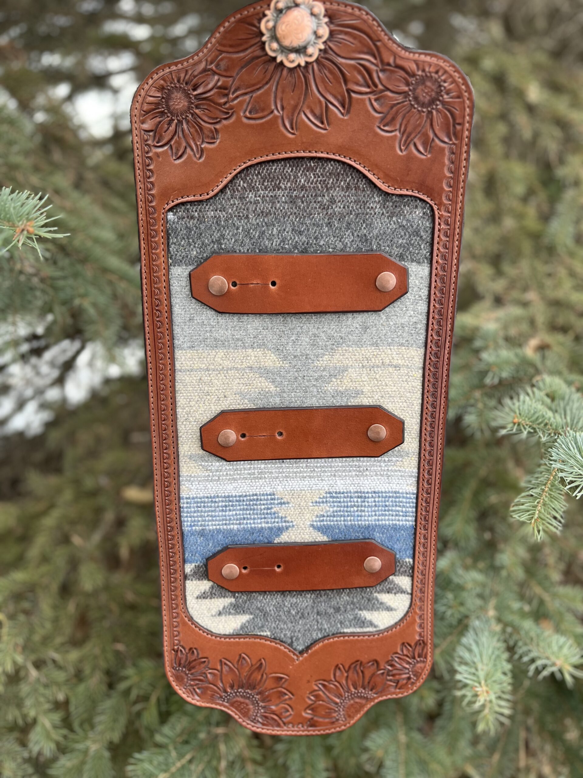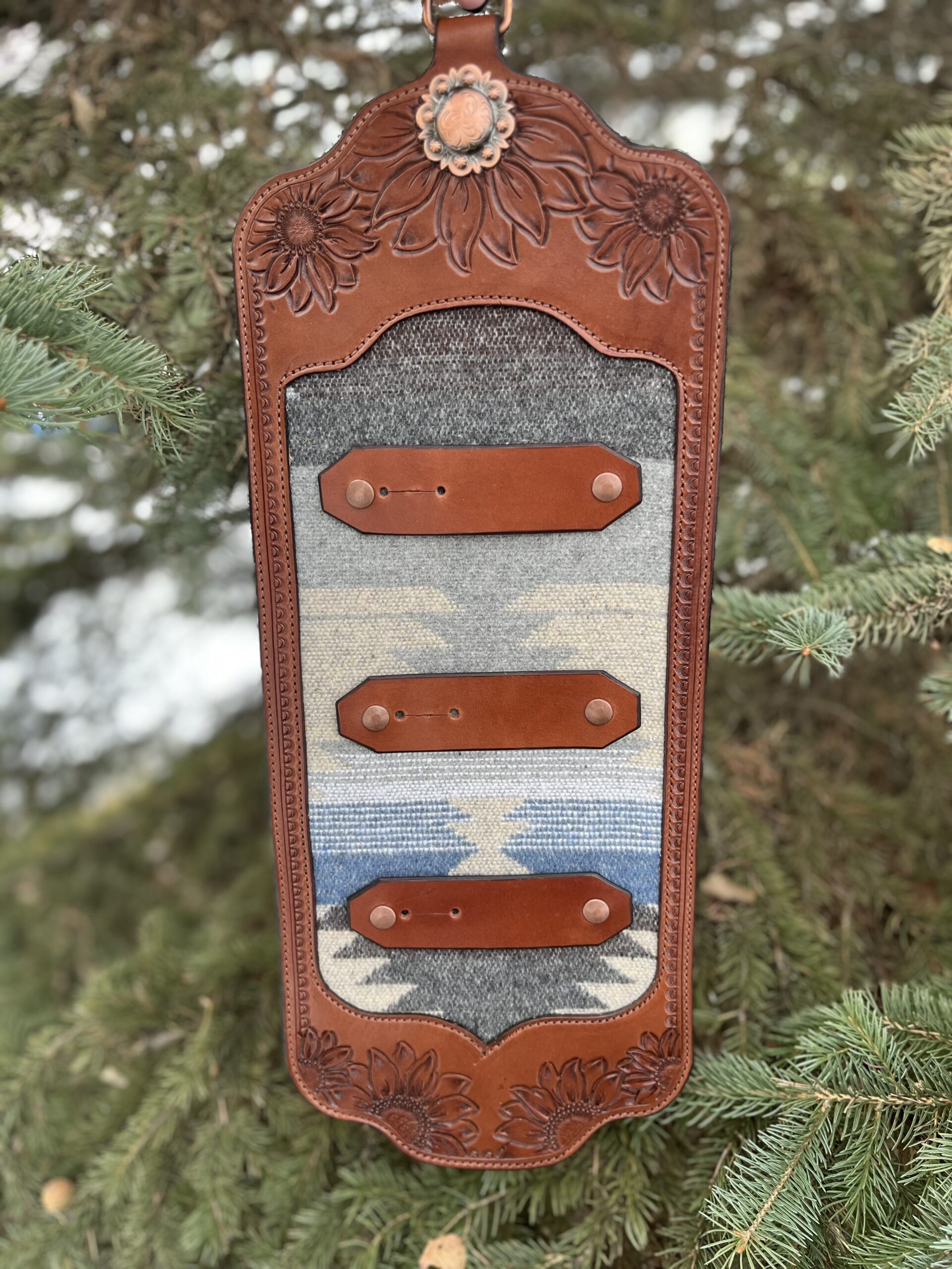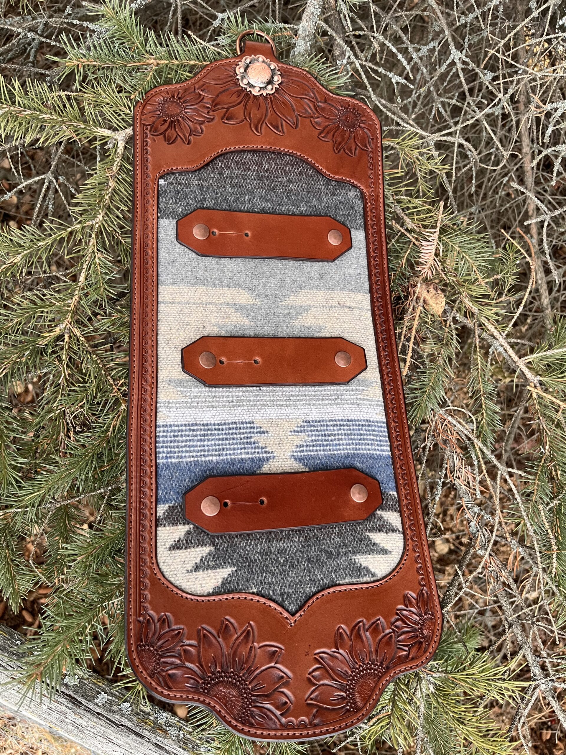 Hand tooled sunflowers with a wool inlay, antique copper hardware, and lined with latigo.