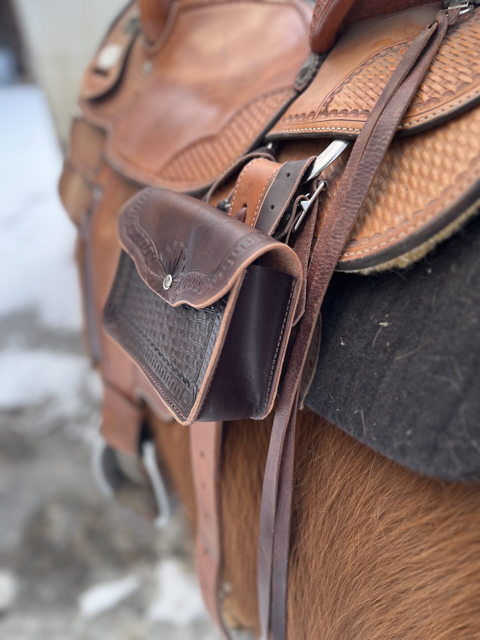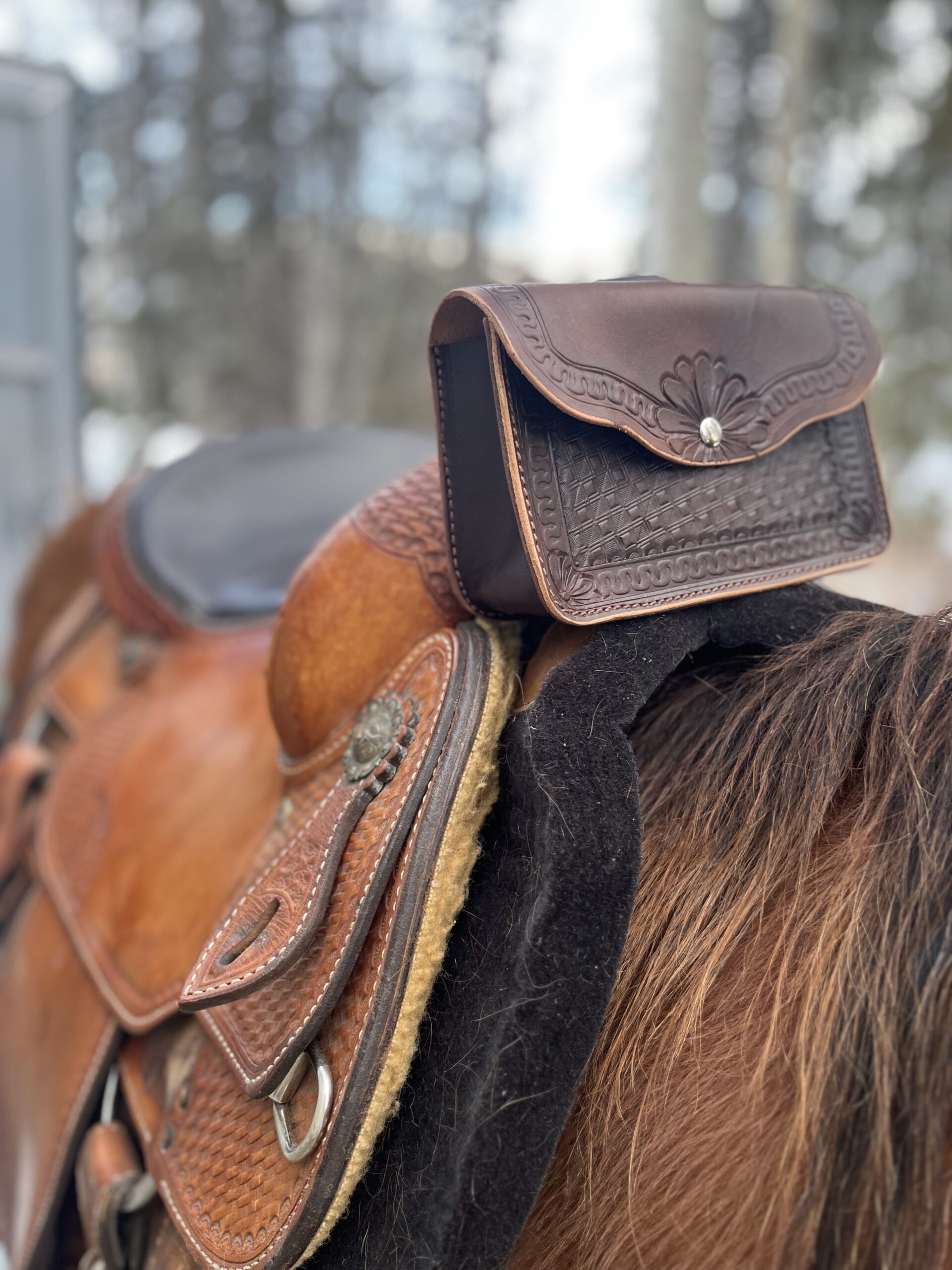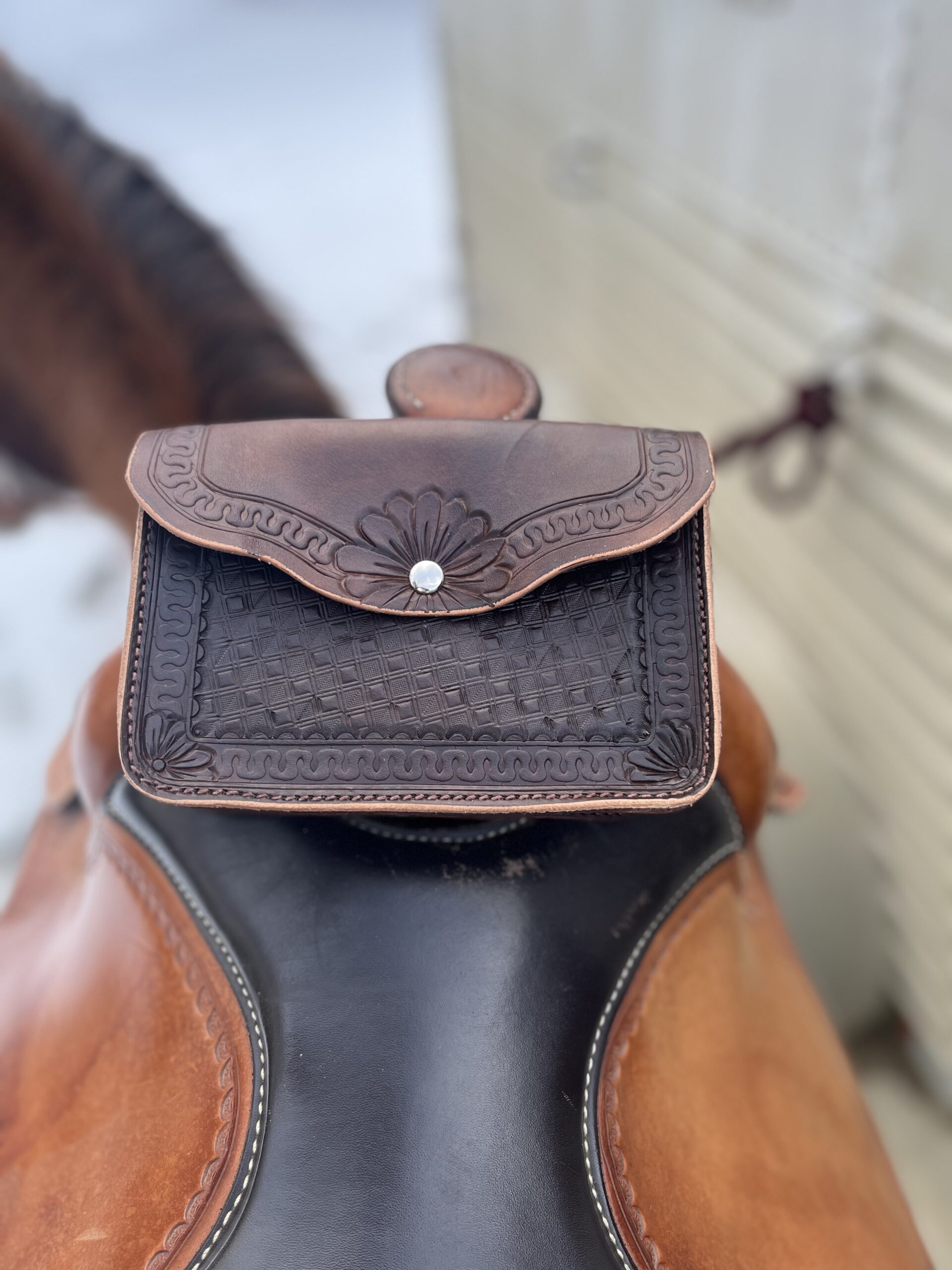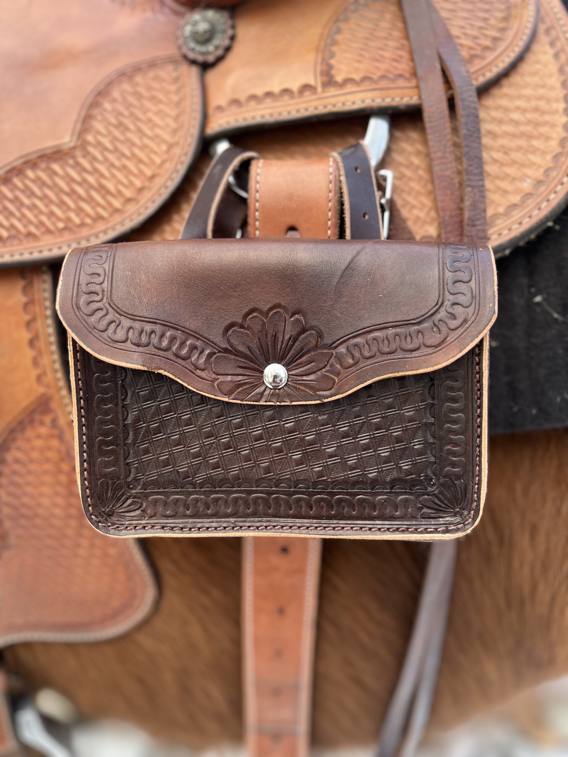 Dark oil tooled bag that can be attached almost anywhere on your saddle.