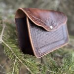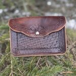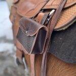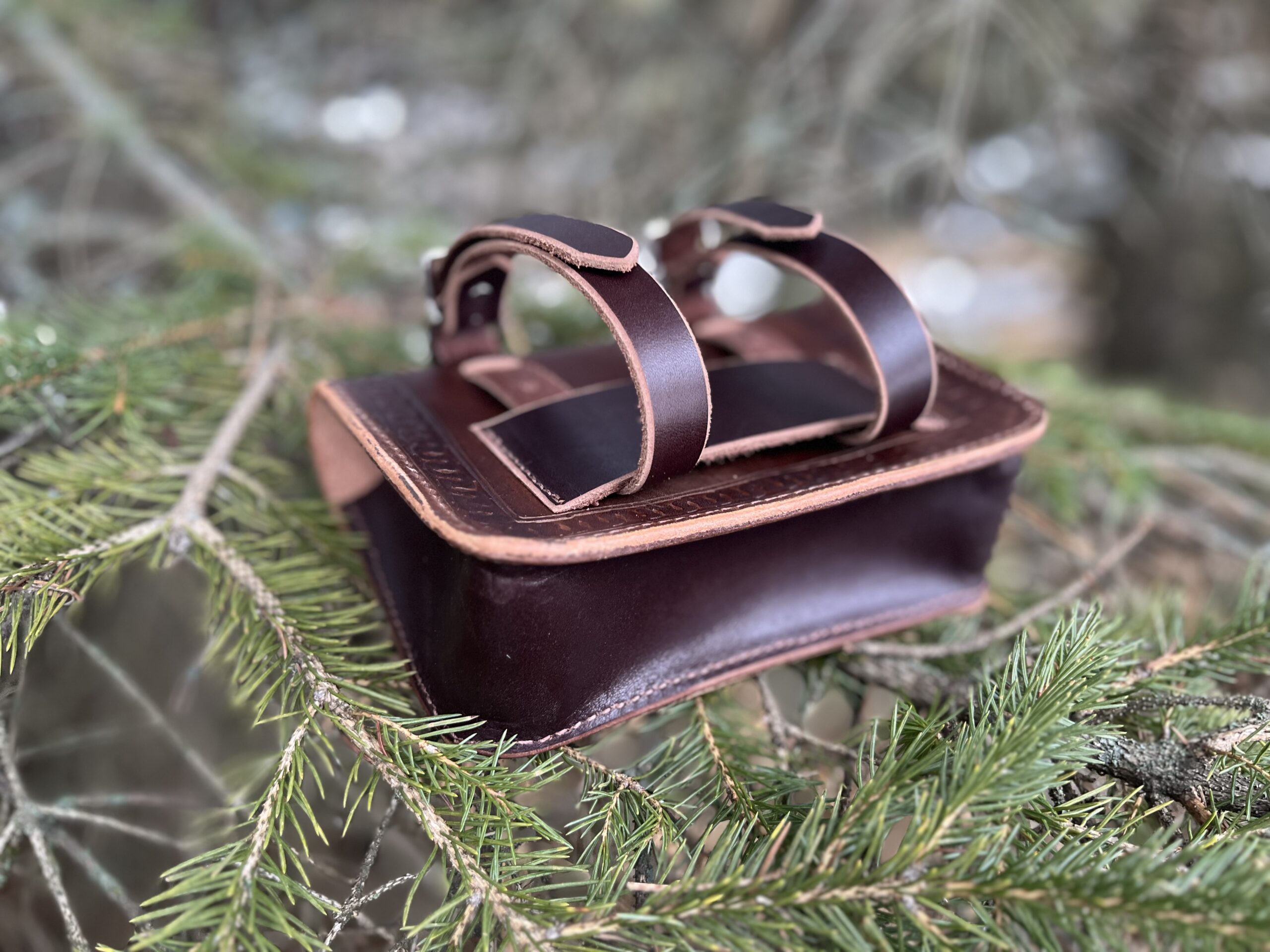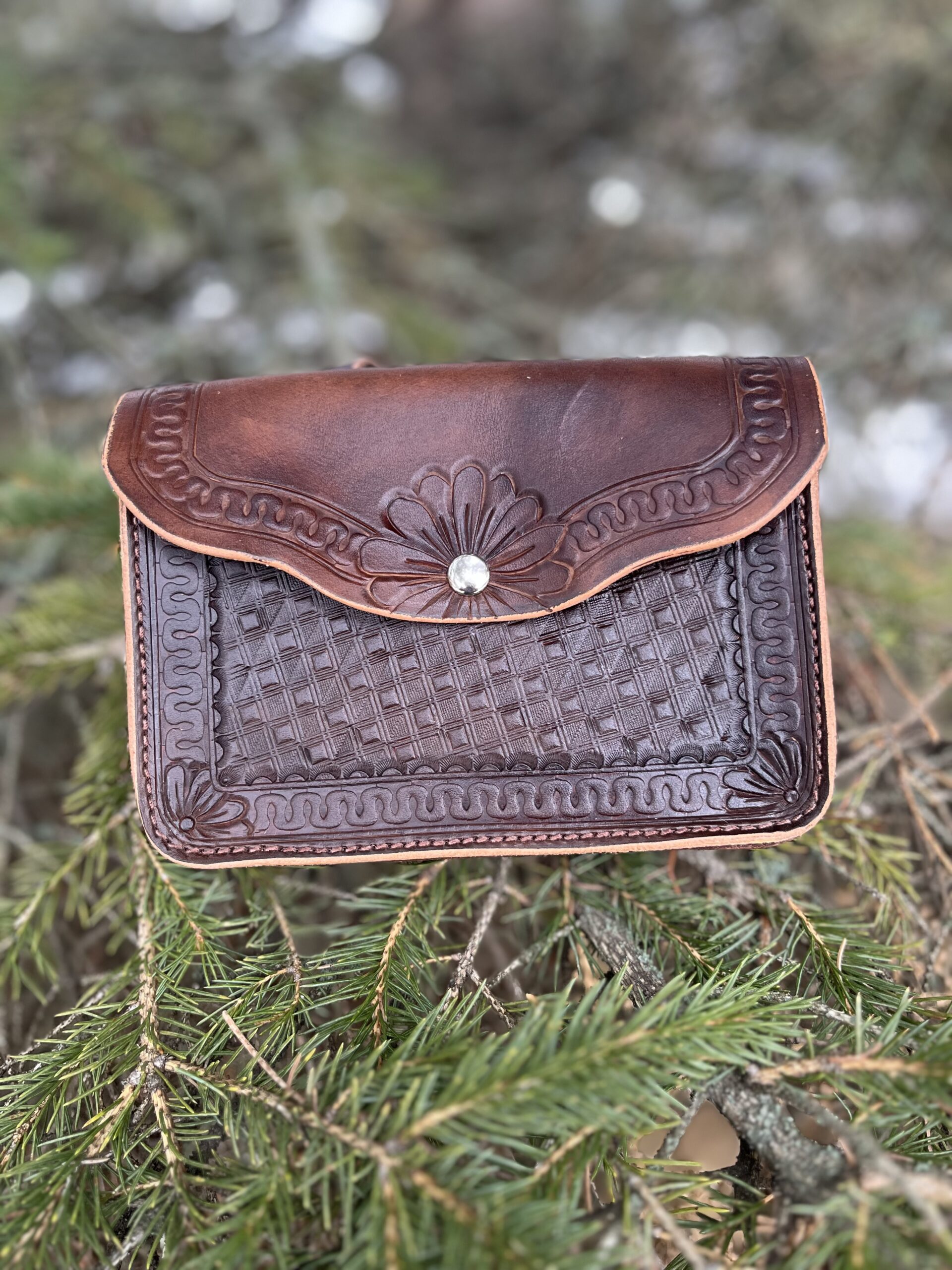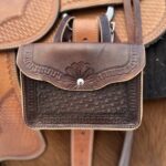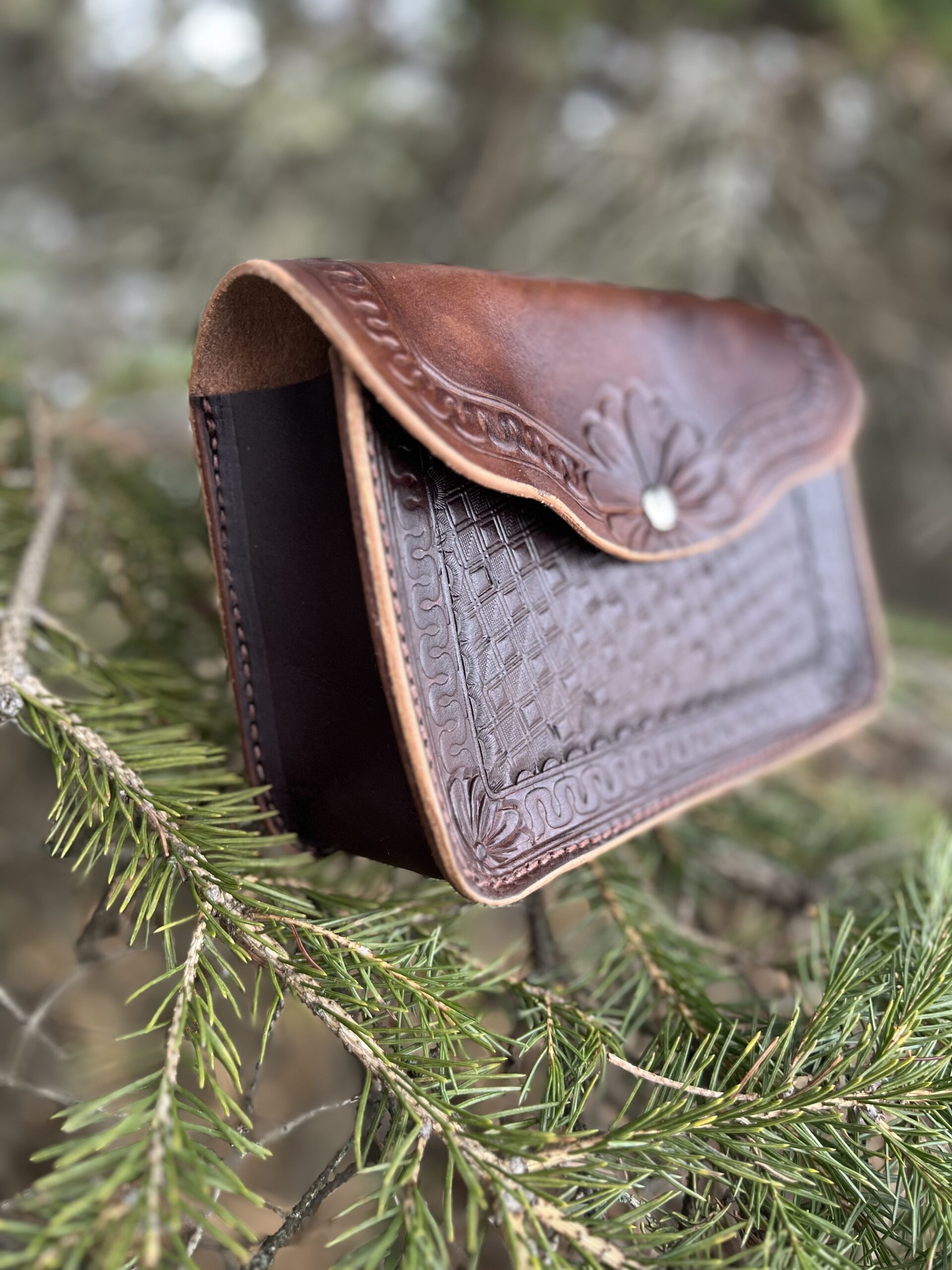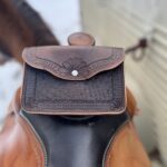 Dark oil tooled bag that can be attached almost anywhere on your saddle.
