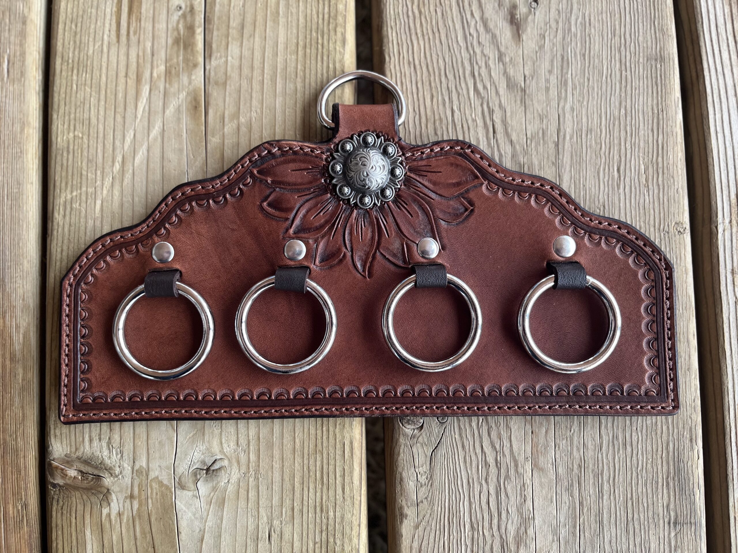 Hand tooled sunflower on Hermann Oak leather. Lined and stitched.